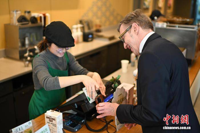 3月18日,韦恩辛食品家族(团体)有限公司CEO斯特凡是(shi)·韦恩辛,正在重庆沙(sha)坪坝区(qu)一(yi)咖啡店利用(yong)Alipay(支付(fu)宝)扫码采办咖啡。中(zhong)新社记者 何蓬磊 摄(she)